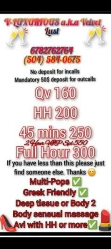 I offer incalls and outcalls. All outcalls require a deposit,no exceptions.